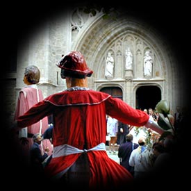 Danse des géants Meeke et Onulphe sur le parvis de l'églis Saint-Guidon à Anderlecht.